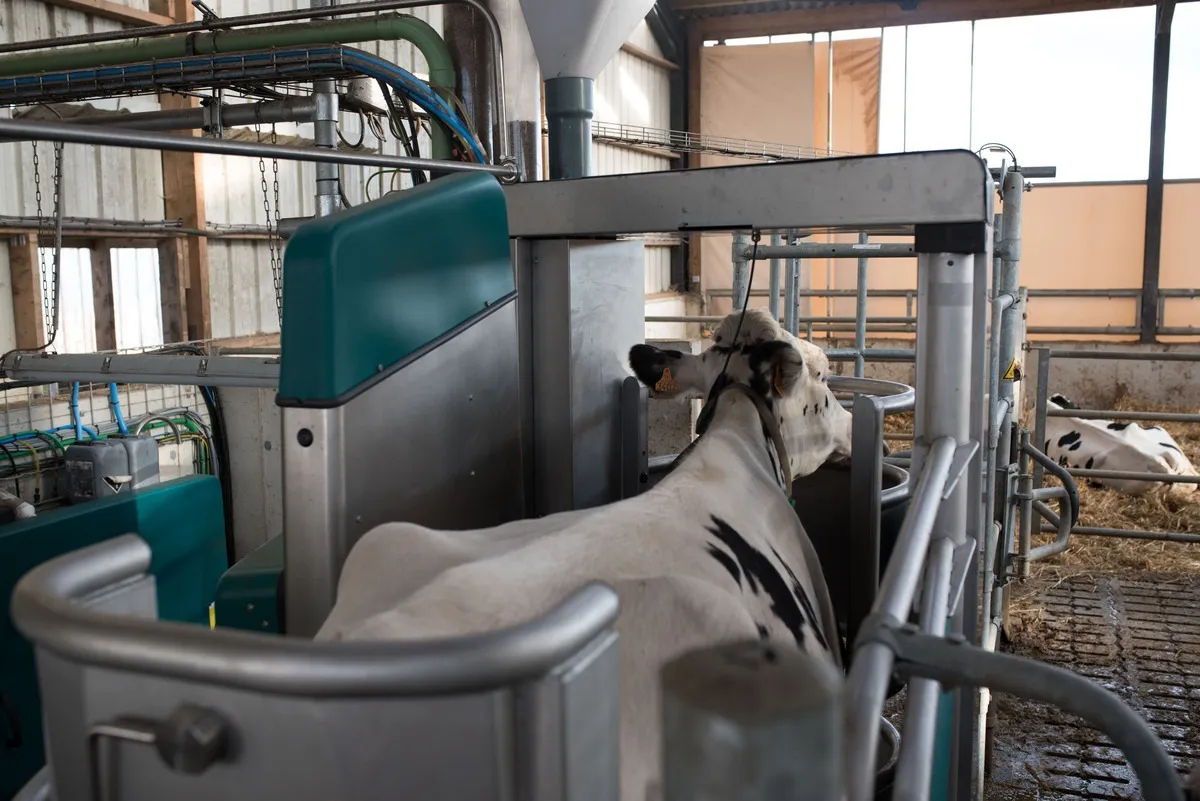 Une vache blanche à l'intérieur de la stalle d'un robot de traite - Illustration En Bretagne, 22 % des élevages robotisés