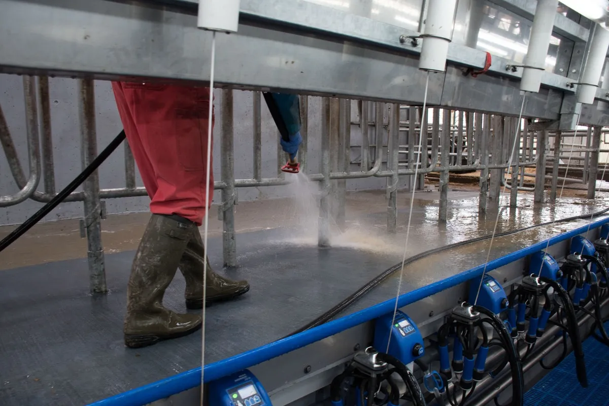 Une personne en train de laver un quai dans une salle de traite - Illustration L’hygiène du bloc traite est incontournable