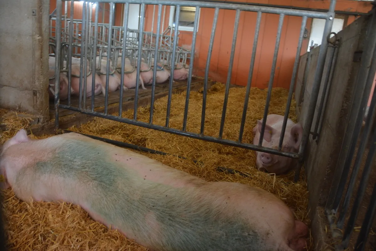 Le site dispose de 2 quarantaines qui accueillent 9 cochettes toutes les 6 semaines. Lors de cette première étape, les cartons placés autour de la truie à la mise bas pour le confort des porcelets nouvellement nés leur sont envoyés afin que ces nouvelles entrantes s’imprègnent du microbisme de l’élevage, afin de les immuniser. Après ce passage sur paille, elles rejoignent une autre salle sur caillebottis et sont toujours en liberté avec un réfectoire, pour s’habituer aux futures conditions de manutention durant leur vie à l’élevage. Douze semaines après leur arrivée, les chaleurs sont synchronisées (utilisation de Regumate) en verraterie. Les truies sont allotées avec des caractéristiques communes, « elles ont le même gabarit, des rangs de portées proches, ce qui diminue la compétition à l’auge ». En verraterie, la paille d’orge saine au sol est sélectionnée. « Si une truie a des soucis d’aplomb, elle peut si besoin rester un mois sur paille en liberté pour régler le problème ». L’été à la moisson, le Finistérien s’oblige à ramasser de la paille sèche. « En cas de doute sur sa qualité, je ne la ramasse pas ».