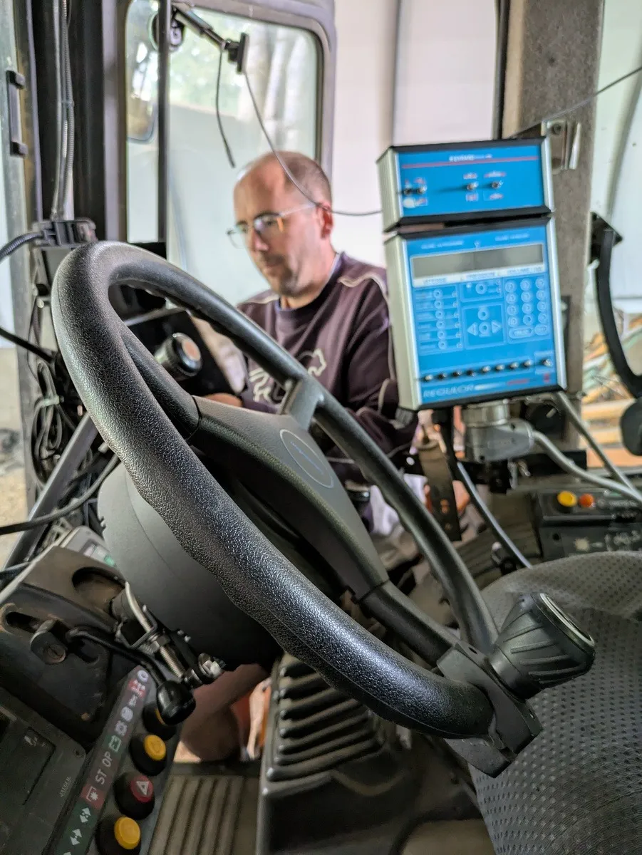 Une fois le montage réalisé, restent deux étapes cruciales : le paramétrage et le calibrage du volant. « J’ai dû mesurer précisément plusieurs dimensions, comme l’empattement, la position de l’antenne par rapport à l’essieu arrière, la distance entre l’essieu et le relevage… » Quant au calibrage du volant selon le tracteur, il est mis en œuvre à distance par le technicien d’Intrax, grâce au modem intégré à la console, nécessaire à la réception du signal RTK Centipede. «La carte SIM est fournie gratuitement pour un an. Je devrai donc souscrire un petit abonnement mensuel à un opérateur de téléphonie, sauf si je fais le choix d’utiliser le partage de connexion de mon Smartphone. La prise en main à distance m’a aussi été très utile pour m’accompagner dans la découverte de quelques subtilités de réglage. Elle évite également le déplacement d’un technicien pour effectuer les mises à jour du système. »