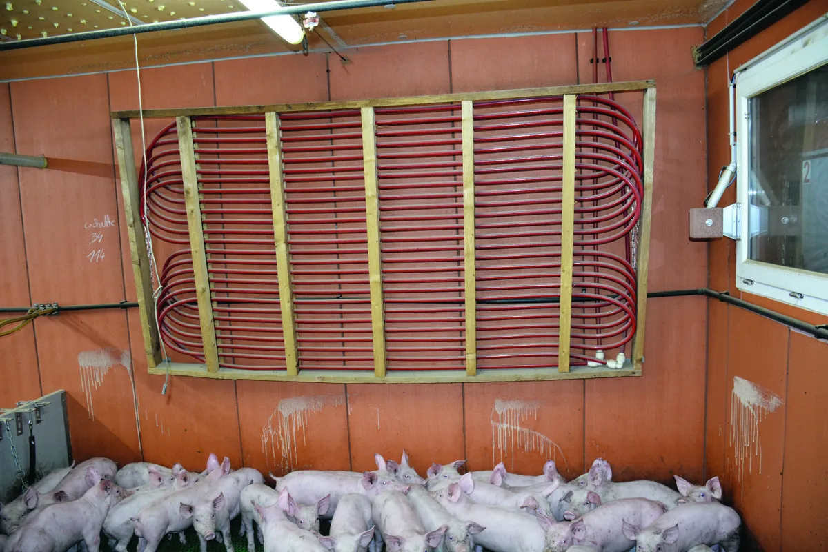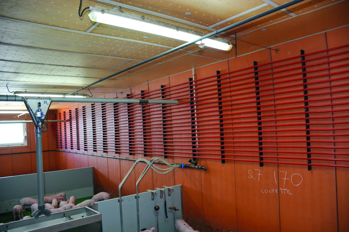 Après 10 ans d’utilisation, les aérothermes des PS ont commencé à lâcher les uns après les autres. « Dans le même temps, on ne sentait pas un confort optimal pour les porcs mais ça n’avait pas de conséquences sur les performances techniques. Les aérothermes pulsent de l’air chaud dans les salles et cela perturbait la veine d’air du circuit de ventilation ce qui dégradait l’ambiance. Il fallait donc les renouveler ou revoir le système de chauffage en trouvant une nouvelle solution », témoigne Marcel Denis. L’éleveur étudie alors les choses avec son chauffagiste qui aurait aimé installer un système de plancher chauffant mais ce n’était techniquement pas possible dans des salles existantes et à moindre coût. « J’ai alors eu l’idée d’un prototype pour le mettre à l’essai dans une salle. J’ai créé un châssis en bois et fixé des tuyaux d’eau chaude dessus. Ce châssis fixé au mur descend à 1 m de hauteur au-dessus des porcs pour créer une sorte de nid. Le système fonctionne et permet d’atteindre la consigne de 29° C au démarrage à 21 jours d’âge pour terminer à 23 °C à 65 jours. Mais ce n’était pas pratique lorsqu’il fallait intervenir autour des cochons dans la case », décrit Éric Rochefort. L’éleveur et son installateur ont alors fait l’essai de laisser le système au mur et le résultat était le même au niveau des consignes de températures sans la contrainte du matériel au-dessus des animaux.