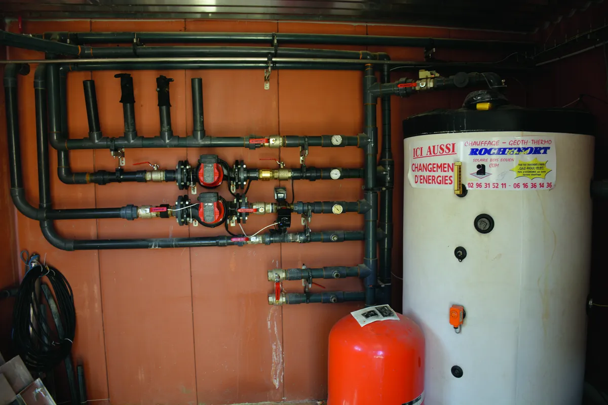 En 2012, Marcel Denis a équipé son élevage de 500 truies naisseur-engraisseur, basé à Plurien (22), d’un système de chauffage par aquathermie. « L’eau pompée dans un forage de 80 m de profondeur est ensuite conservée sous les couloirs dans le long de la maternité. Selon les besoins, cette eau est envoyée vers les 2 pompes à chaleur de 60 kW chacune pour récupérer les calories qui vont permettre de chauffer l’eau à 45°C qui est ensuite stockée dans un ballon tampon. L’eau chaude sert pour le chauffage des 96 plaques chauffantes situées en maternité et à alimenter les aérothermes en post-sevrage de 3 240 places », explique Éric Rochefort, gérant de l’entreprise Rochefort R et D située à La Bouillie (22) qui a réalisé cette installation.