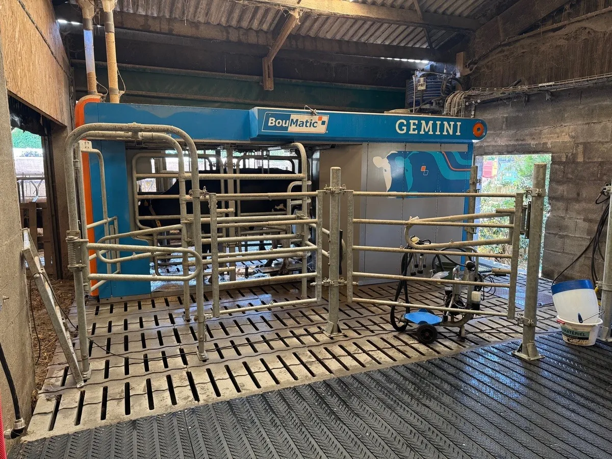 Le robot de traite (Boumatic) gère 45 vaches à la traite. « Il n’est pas bousculé », sourit le jeune homme. « J’aime voir les vaches dehors. La possibilité de pâturer – en faveur du bien-être animal – faisait partie du cahier des charges lors de notre réflexion sur l’automatisation. » La stalle non saturée permet au troupeau de sortir facilement de mars à mi-octobre. Une porte de pâturage est installée à l’opposé dans le bâtiment. Avec 12 ha en prairies (découpés en paddocks d’1 ha pour trois jours, gérés au fil avant) sur les 15 accessibles, le pâturage représente 25 ares par vache. Des abreuvoirs sont disponibles partout à l’herbe. Les animaux reviennent d’eux-mêmes vers la stabulation (l’entrée de paddock la plus lointaine est à 600 m). « Au printemps, ils peuvent sortir tout le temps. En général, ils vont à l’herbe de 8 h à 14 h, puis à nouveau à partir de 20 h et rentrent dans la nuit à l’étable. » Pour autant, le silo de maïs reste ouvert toute l’année. Pour adapter la ration de base distribuée à 8 h à l’étable, l’intensité du pâturage est jugée « en fonction de ce qu’il reste à l’auge ». La ration mélangée a été déconcentrée en aliment avec l’arrivée du robot, une partie des concentrés (tourteaux 70/30, maïs et orge aplatis) étant désormais apportée lors des traites.