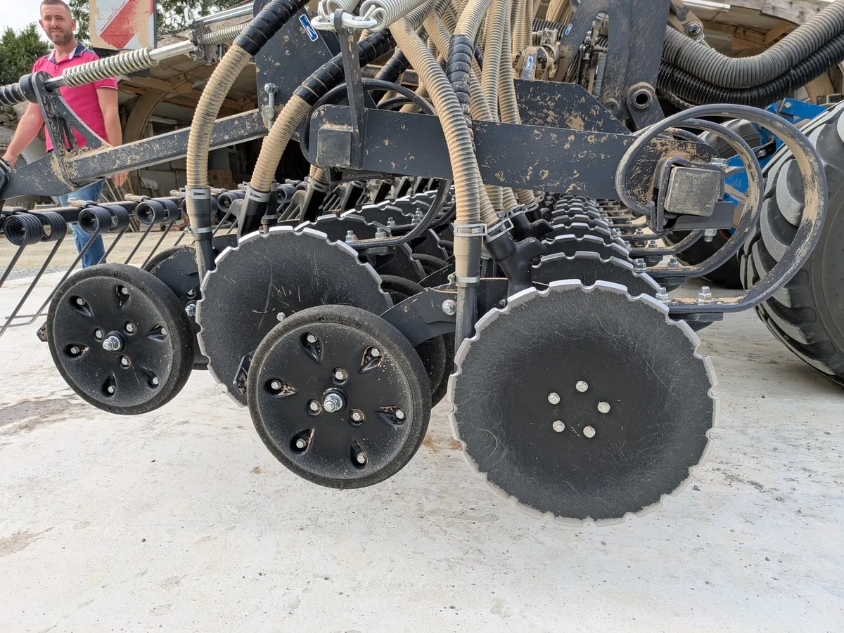 Outre la meilleure accessibilité pour le chargement de la semence et le réglage des doseurs, l’agriculteur liste plusieurs avantages en faveur de cette trémie frontale. « Un système de vannes permet d’envoyer la semence issue de chacun des deux doseurs dans l’un ou l’autre des deux circuits pneumatiques. Cela améliore encore la polyvalence de la barre de semis P100 à simples disques crantés. Je peux choisir sur quelle descente de l’élément arrive chaque produit. Grâce à la forte pression qui peut lui être appliquée, cet élément passe dans toutes les conditions. »