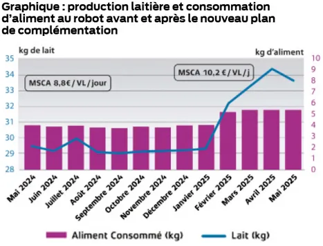 L’objectif est de densifier la ration en énergie pour un meilleur équilibre entre la complémentation azotée et énergétique.Il a donc été ajouté 1 kg de Proddi Néo Epi au robot et la correction azotée a été revue à la baisse en adaptant les tables d’alimentation à chaque vache en fonction de son pic de production. Cet aliment de production, fabriqué par Nutréa, est riche en maïs et donc plus concentré en UFL. Un choix gagnant, puisque la production laitière a progressé de 4 kg en moyenne depuis janvier 2025. La marge sur coût alimentaire est ainsi passée de 8,8 €/vache/jour à 10,20 €/vache/jour, soit un gain d’environ 21 000 € pour l’ensemble du troupeau sur 4 mois.