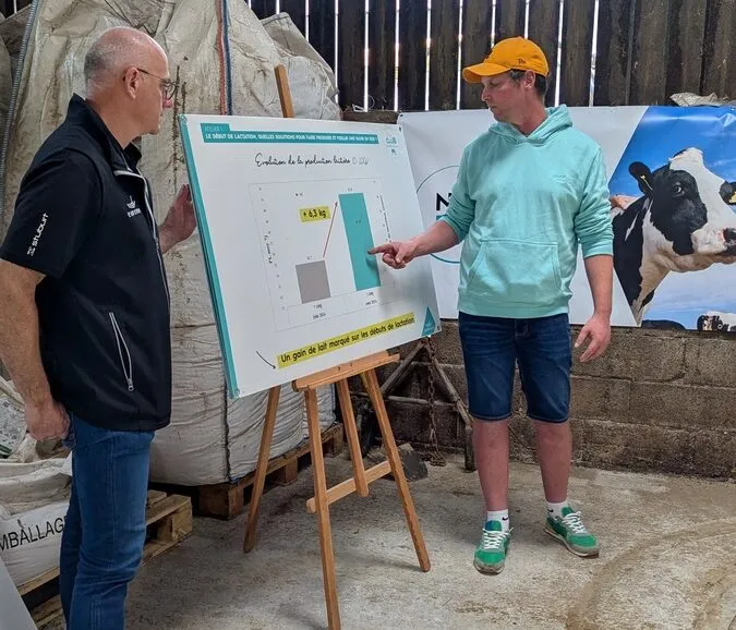 Les éleveurs constatent rapidement les bénéfices. En une semaine, les vaches fraîchement vêlées ont gagné 3 litres au pic, et après un mois, une augmentation de 3,5 kg de lait a été observée sur l’ensemble du troupeau, soit un gain de 0,50 € de marge par vache pour une production à 42 kg.