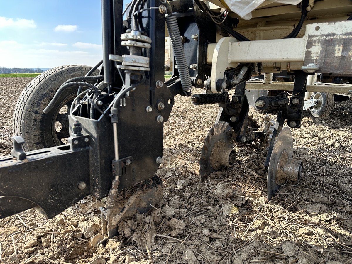 Attelé derrière un 4×4, le Veris recueille de nombreuses informations lors de son passage. Quatre disques traversés par un courant électrique mesurent la conductivité des sols, qui permet par la suite de caractériser les différents types de sol de la parcelle. Une lentille infrarouge montée sur un coutre estime le taux de matière organique, tandis qu’un GPS relève la topographie. « Tous les 60 mètres, je m’arrête pour mesurer le pH du sol grâce à deux sondes placées sur le scanner », précise Stéphane Échard, qui est aujourd’hui prestataire pour Precifield et intervient chez leurs clients pour scanner leur parcellaire. L’outil doit être passé tous les 15 m, à une vitesse d’environ 4 km/h. « Je fais environ 4 ha/h », ajoute-t-il.