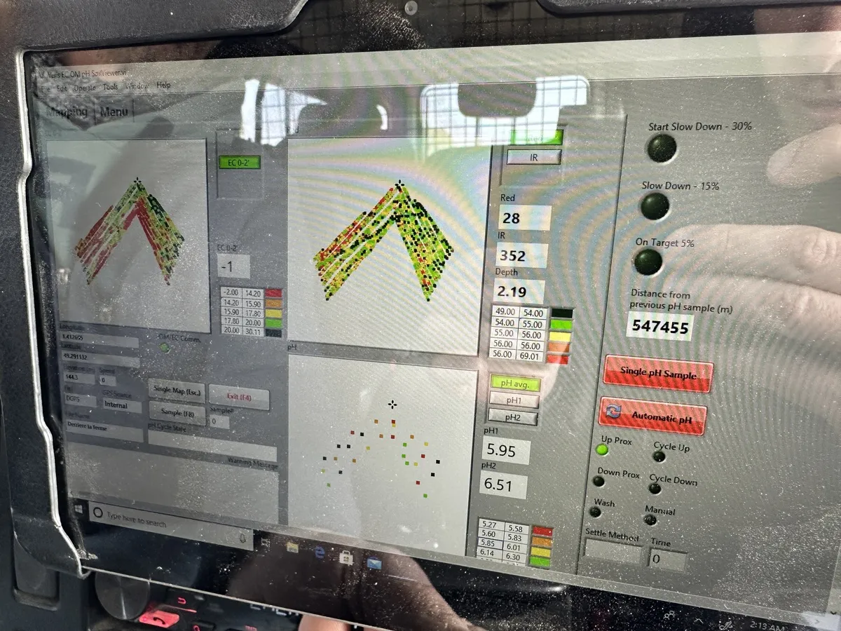 Pour optimiser la précision des données, des conditions légèrement humides sont recommandées lors du passage. « L’idéal est de travailler au printemps ou en fin d’automne », indique Stéphane Échard. « Le sol peut être couvert, car l’attelage n’endommage pas la culture. Je suis déjà passé dans de l’orge sans aucun problème. » Dans l’habitacle du véhicule, une tablette permet d’avoir l’œil sur la collecte des données en temps réel. Après le passage, des analyses de sol, effectuées par un laboratoire agréé, sont nécessaires pour « calibrer les données. » En moyenne, une analyse est requise tous les 2,5 ha. « Une fois les résultats reçus, Precifield compile toutes les données pour générer les différentes cartes. » Sur l’exploitation de Victor Échard, les parcelles sont majoritairement constituées de limons profonds avec certaines zones argileuses lourdes. « Notre parcellaire est assez vallonné et les ruptures de pente sont globalement plus argileuses », note Stéphane Échard. La matière organique est d’environ 3 % et le pH se situe entre 7 et 8.