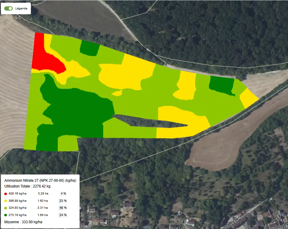 La modulation des apports d’azote se base sur des images satellites captées tous les 3 jours. Ces images permettent d’évaluer la biomasse et d’adapter les doses en fonction du développement de la culture au sein d’une même parcelle. Comme pour les semis, les cartes de modulation se génèrent en quelques clics depuis la plateforme. Victor et Stéphane Échard utilisent un épandeur de 28 m capable de moduler gauche-droite. « Sur blé, nous modulons dès le 1er apport pour développer le tallage et la biomasse », affirme le Normand. « Selon les parcelles et les années, certaines zones ne reçoivent rien et d’autres le double de la dose de base. »