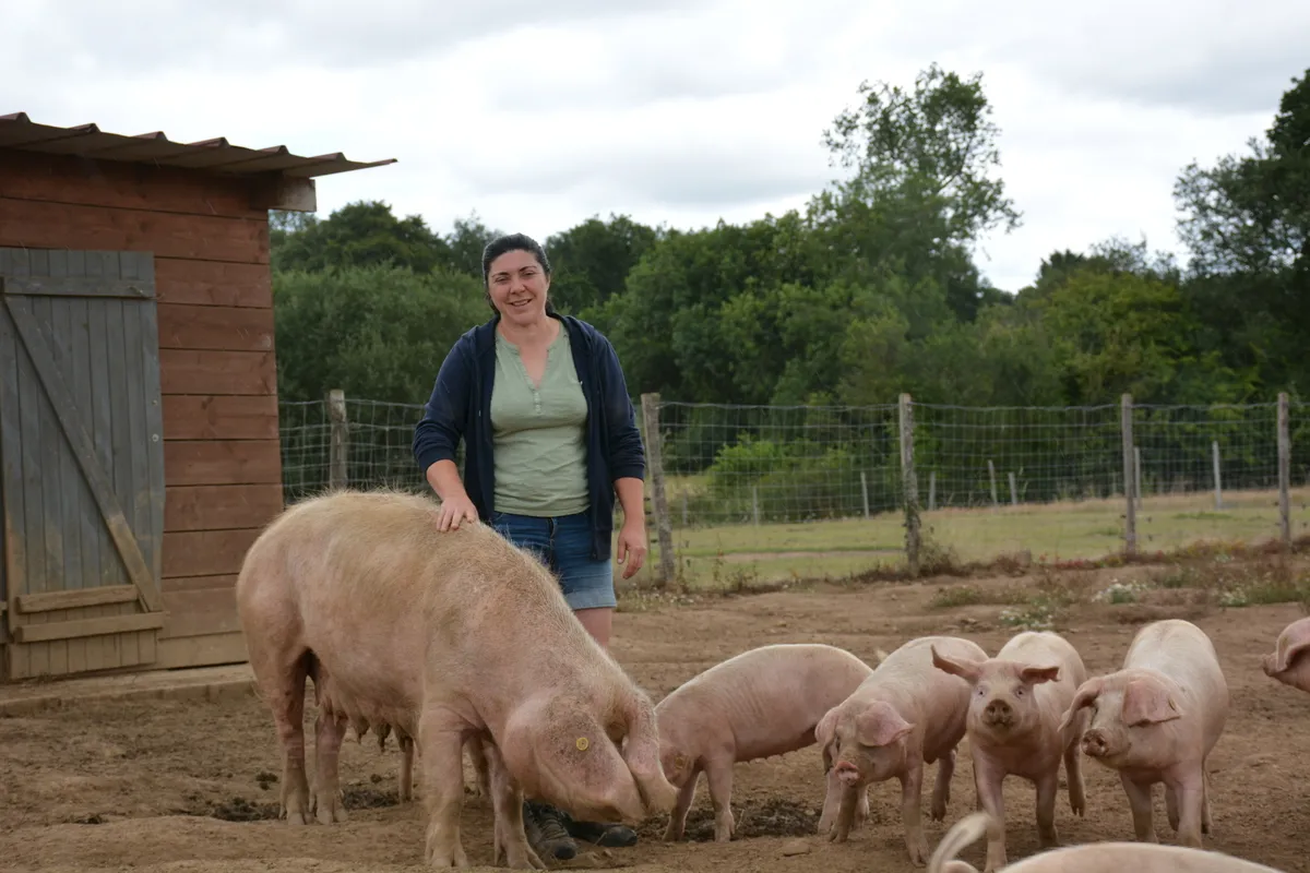Régulièrement, lorsque son mari était salarié d’élevage et de garde le week-end, elle l’accompagnait au travail. « J’ai aimé le contact avec l’animal. Je voulais me lancer dans l’élevage en le faisant différemment. Je voulais pouvoir nourrir mes voisins et avoir un contact avec le client pour retrouver ce que j’aimais dans mon ancien métier. L’élevage plein air et la vente directe ont été pour moi des évidences. J’avais la chance d’avoir 15 ha de foncier groupés autour de notre maison. Lorsque Christian a arrêté sa ferme, il a conservé le foncier qu’il avait en propriété et cela m’a permis de m’installer. Depuis, j’ai récupéré 10 ha supplémentaires en location qui appartiennent au frère de mon mari. »