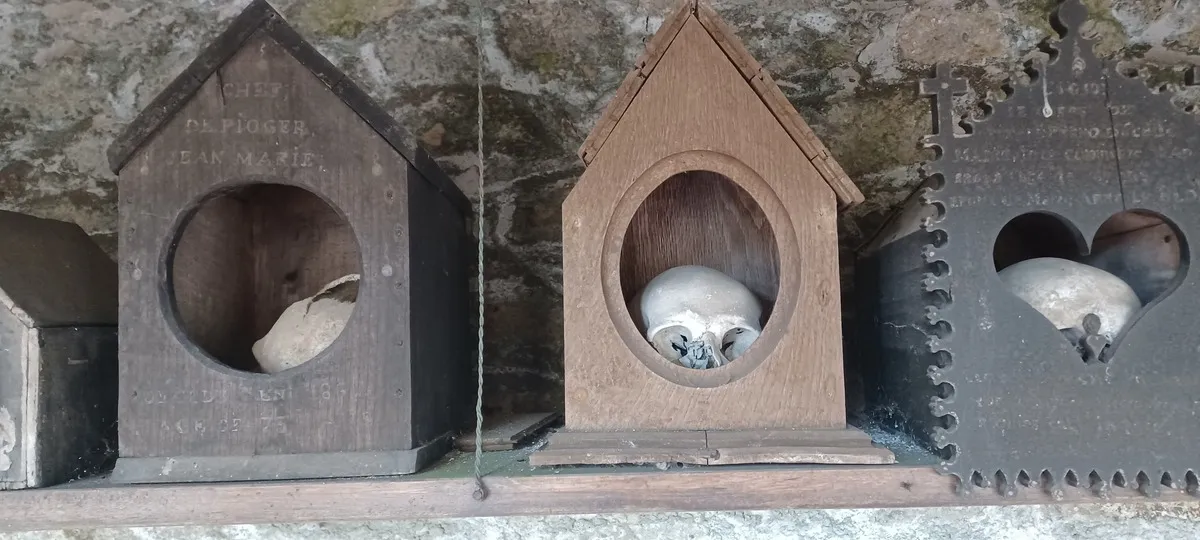 On en dénombre 66 en Bretagne. Le plus bel ensemble se situe à la cathédrale Saint-Pol-Aurélien à Saint-Pol-de-Léon (29), avec une trentaine de boîtes. Si elles se retrouvent aujourd’hui rangées dans un enfeu (niche funéraire), alignées sur trois étagères et protégées de la profanation ou du vol derrière une grille, il n’était pas rare de les voir disposées autrefois autour du chœur, accrochées aux murs des églises, nichées au-dessus des confessionnaux, ou placées dans les ossuaires. Mais que contiennent-elles ? Ni reliques sacrées ni objets liturgiques… juste des crânes des défunts de la paroisse.