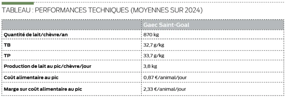 Repères Gaec Saint-Goal : 5 UTH dont 2 associés et 3 salariés ; 250 chèvres laitières de race Saanen ; 155 000 litres de lait transformés (fromages frais, à pâte pressée cuite et non cuite, yaourts). Plats préparés à base de chevreaux ; SAU : 30 ha d’herbe et 13 ha de céréales (maïs, orge) ; Canaux de distribution : magasin de vente à la ferme, grossistes, revendeurs.