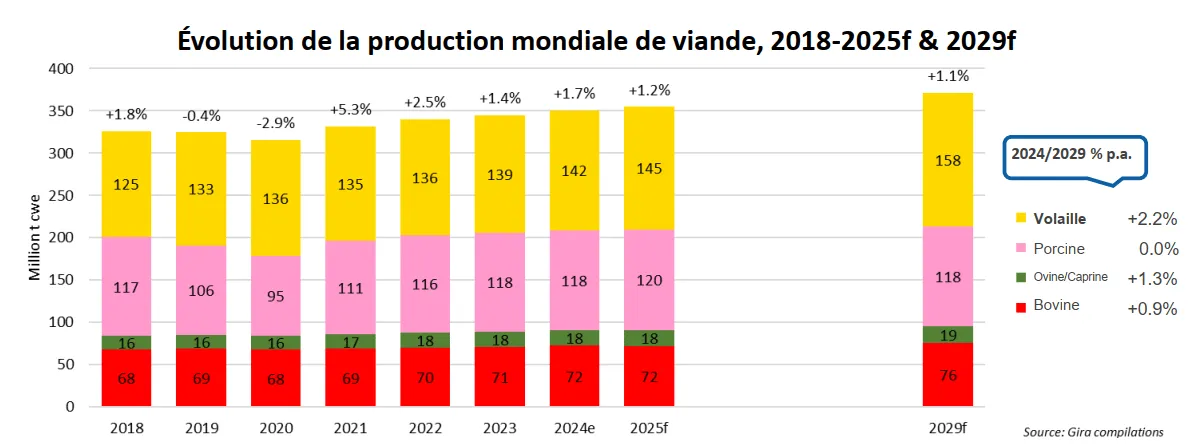 L’évolution de la production mondiale de viande est tirée vers le haut par la viande de volailles. À horizon 2029, cette progression de +2,2 % par an est entraînée par une hausse significative de la consommation. Cette évolution de production mondiale se confirme dès cette année malgré les périodes de grippe aviaire.