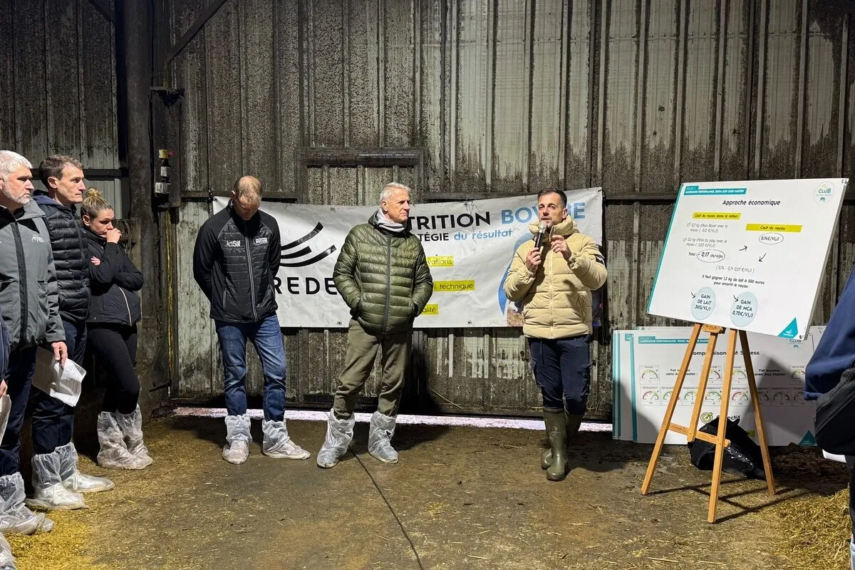 Des hommes rassemblés dans un bâtiment d'élevage laitier - Illustration Garder l’Å“il sur l’équilibre de toutes les rations