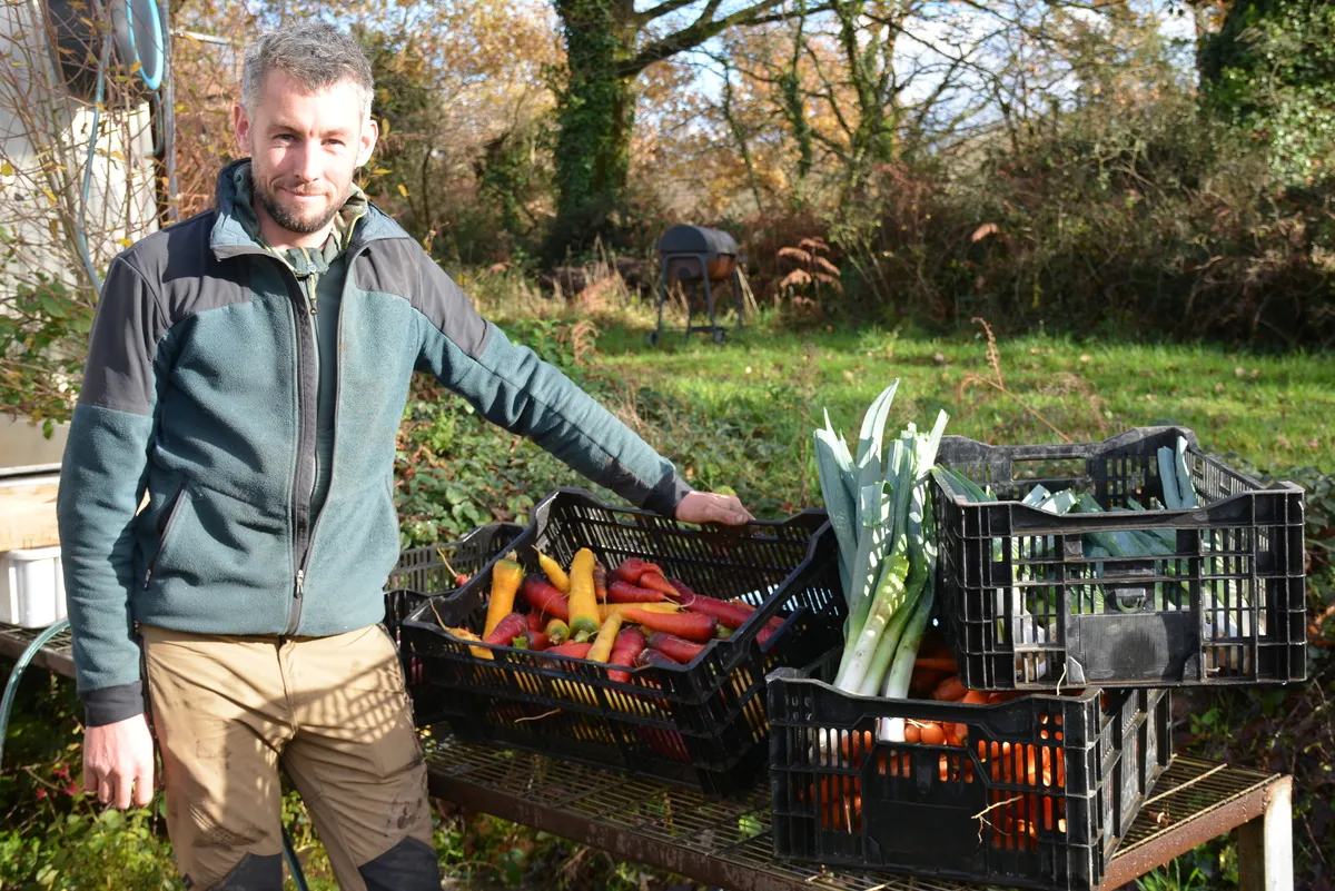 Un homme dans un champ devant des cageots en plastique avec des légumes - Illustration Les agriculteurs bio veulent peser lors des municipales