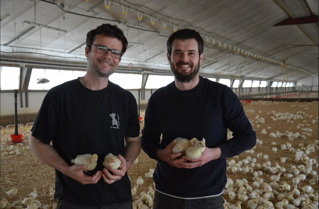 Deux hommes souriants dans un bâtiment d'élevage de volailles avec de poussins dans les mains - Illustration Un groupement qui soutient la filière volaille de chair