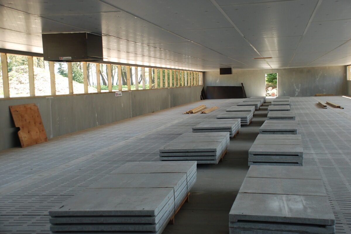 Intérieur d'un bâtiment d'élevage porcin en construction - Illustration 7 Md € à investir  pour être autosuffisant
