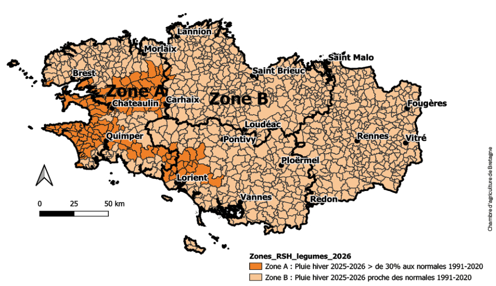 Ce correctif va permettre d’ajuster (diminuer ou augmenter) la dose pivot proposée pour chaque légume. La dose pivot tient compte d’un RSH moyen et d’un reliquat non extractible par es cultures.Le correctif RSH est calculé en fonction de la pluviométrie hivernale (octobre à janvier inclus) par rapport aux ‘normales’ trentenaires. Ce correctif s’applique donc en cours de saison, à partir du mois de février et uniquement jusqu’aux implantations printanières (jusqu’au 30 avril) :• Si la pluviométrie d’octobre à janvier inclus est inférieure de 30 % aux normales, alors le correctif est de -10 unités (aucune commune concernée en 2026).• Si la pluviométrie d’octobre à janvier inclus est supérieure de 30 % aux normales, alors le correctif est de +10 unités (Zone A : communes en orange foncé sur la carte, surtout en Centre-Finistère et Sud-Ouest Bretagne)• Si la pluviométrie annuelle est proche des ‘normales’ (+ ou -30 %), alors il n’y a pas de correction RSH (ZONE B : communes en orange clair sur la carte).