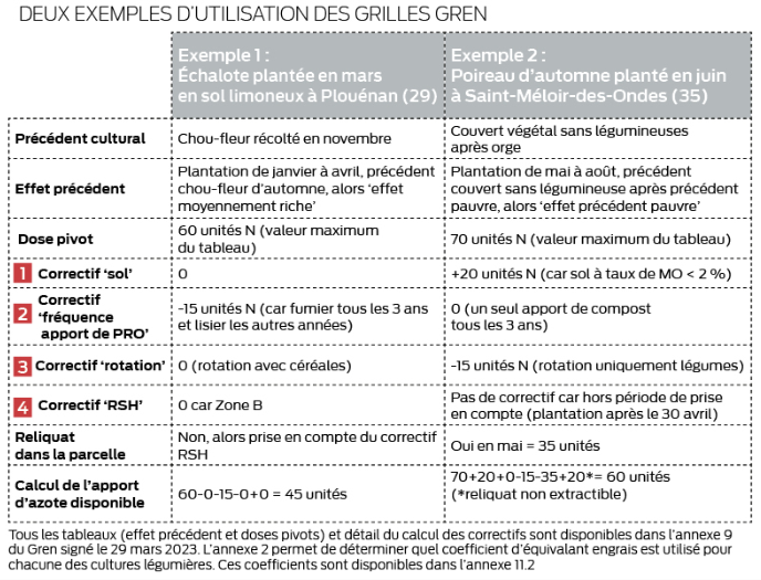 Les grilles Gren pour piloter la fertilisation des légumes frais de plein champ ont été modifiées lors du dernier arrêté Gren paru en mars 2023. Ces grilles ont apporté 3 modifications principales pour mieux correspondre à la diversité des situations culturales :• La grille sur l’effet du précédent a été complétée et prend en compte la période d’implantation des cultures (printemps ou été) ;• Le tableau des doses pivots a été complété par de nombreuses cultures ;• La mise en place de 4 correctifs de la dose pivot. Ces correctifs permettent d’affiner le calcul de la dose à apporter en fonction du type de sol, de l’historique d’apports d’effluents d’élevage, du type de rotation et enfin un correctif ‘Reliquat Sortie d’Hiver’. Ces correctifs ne sont utilisés que pour la dose à la mise en place (plantation ou semis).