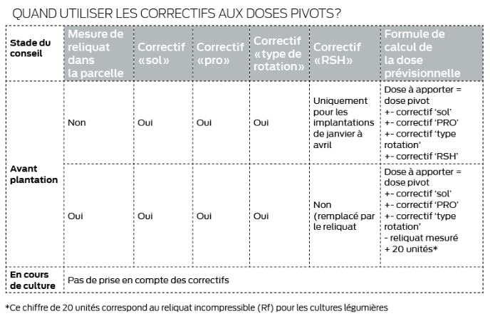 La dose pivot est proposée pour un sol normalement pourvu en matière organique (M0 > 2 %). Un surplus d’apport d’azote de +20 unités est proposé pour les sols à faible minéralisation, c’est-à-dire pour les sols à taux de MO < 2 %, en système endivier ou les sols sableux (> 55 % de sable).