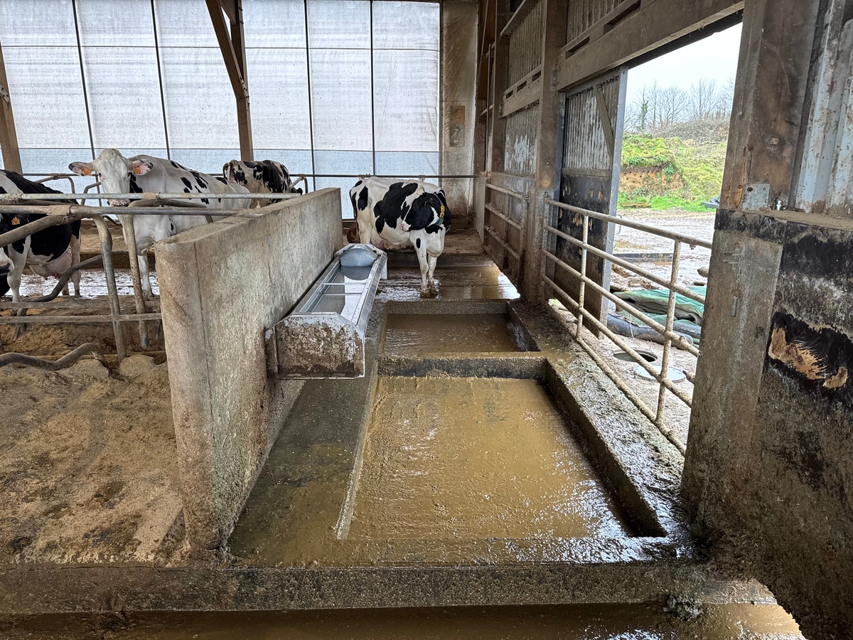 Auparavant, les lésions de dermatite étaient régulièrement nettoyées et soignées en salle de traite. « C’était chronophage. La durée de traite était allongée. » Désormais, en système robot, tous les mardis matins au Gaec, c’est jour de bain de pieds. « Il n’y a pas vraiment d’autre choix pour contenir la maladie que de réaliser ces traitements collectifs », estime le Finistérien. Au fond de l’étable, dans le passage (5 m de long) entre les deux aires d’exercice, deux bacs successifs en béton de 700 L chacun ont été prévus dès la construction de la stabulation. « Il fallait que ce soit pratique à remplir et à vidanger. Un pédiluve, on ne le fait que si c’est facile à faire. Comme l’espace pédiluve fait partie de l’environnement quotidien des vaches, il n’y a pas de réticence : en 20 minutes, tout le monde a trempé ses onglons et nous vidons… », explique Stéphane Martin, salarié. Le premier pédiluve est rempli d’eau, le second de solution désinfectante. Les éleveurs utilisent deux produits aux matières actives différentes. Ils alternent une semaine sur deux par précaution, « pour limiter le risque de résistance ».