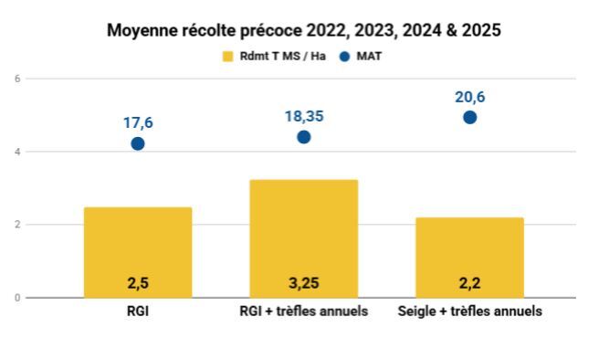 Concernant les pérennes (RGH-RGA), un apport à partir de 300°C jour est bénéfique aux mélanges. À noter que sur ce genre de mélange, hormis l’azote, les exportations de potasse notamment sont très importantes. Les apports organiques ne suffisent pas tout le temps. Il est donc conseillé de regarder la balance apport/export afin de préserver l’équilibre des espèces dans la parcelle.