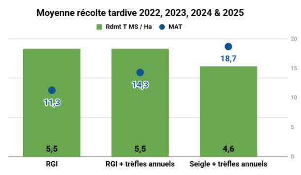 • La récolte tardive permet de gagner 2,55 t MS/Ha mais dégrade la MAT de 4 points ;