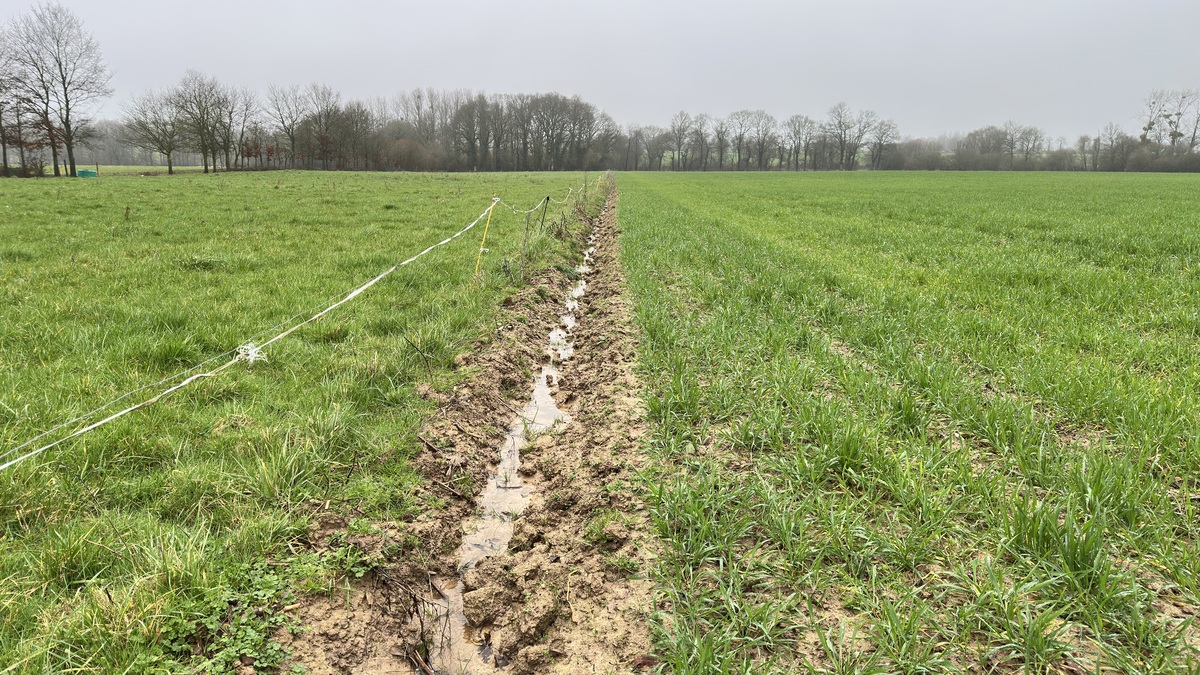Dans les prochains jours, Jérôme Thomas va faire pâturer quelques moutons de Ouessant sur une partie de son blé. « J’ai délimité un petit paddock de 200 m2 que je vais déplacer sur environ 30 ares. La littérature montre que cette pratique a un effet désherbant et stressant pour la culture qui va taller davantage. Leurs déjections sont aussi un engrais gratuit. » La technique a notamment été testée par les Civam de Normandie. « Comme pour le Vibrosem, je ne réinvente pas la roue, le pâturage des céréales par les moutons existe depuis très longtemps. »Si le passage de herse étrille est possible en mars, l’agriculteur pense également à laisser une zone sans désherbage, « pour avoir une idée de l’impact de l’outil sur la minéralisation et sur la culture. »Enfin, le Bretillien a noté que la raie de charrue à l’extrémité de champ où le labour a été terminé joue le rôle d’un caniveau naturel (voir photo).