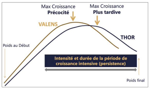 « Nous regardons aussi comment les animaux consomment. Thor possède un profil de consommation supérieur au Valens sur la période de croissance et exprime un plus fort potentiel de consommation sur la période de finition. Ce qui peut induire une dégradation de l’IC s’il n’est pas rationné après avoir atteint son GMQ maximal, vers l’âge de 120 jours. Le ratio ‘lysine digestible / énergie nette’ devra aussi être augmenté en finition sur ce profil d’animaux. »