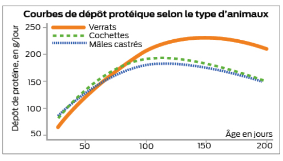 S’agissant plus particulièrement des mâles entiers, des recommandations alimentaires plus adaptées sont aussi proposées par Axiom. « Ces animaux présentent davantage de potentiel de dépôts musculaires que les mâles castrés. Par contre, ils sont plus tardifs et plus persistants dans les dépôts protéiques », indique Laurent Roger. Par rapport aux femelles, les mâles entiers doivent ingérer 8 à 12 % de lysine digestible en plus, et les mâles castrés 5 % en moins.
