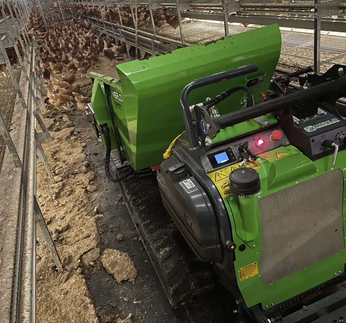 Chaque lot de pondeuses reste environ 14 mois en bâtiment. Pendant cette période de production, l’éleveur intervient avec ce transporteur en présence des animaux. « Je démarre la machine à un petit régime moteur dans le poulailler pour que les poules s’habituent au bruit, puis je monte les gaz progressivement, mais je reste à mi-régime. Le moteur diesel est assez silencieux ». Toujours dans l’optique de ne pas stresser les animaux, la lumière est abaissée, le flux lumineux divisé par 4. « Je n’ai jamais eu d’étouffement depuis que j’utilise ce porteur, ce ne serait pas le cas si une équipe de 5 ou 6 personnes venaient curer ».