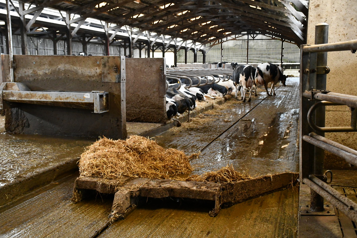 Dans le bâtiment de 130 m de long, les vaches se reposent dans des logettes recouvertes de paille rotocutée. Les racleurs hydrauliques passent deux fois par jour dans les aires d’exercice. « Un espace avec une cage de contention permet un parage régulier des vaches. » Aujourd’hui, la production moyenne au robot est de 40 kg/VL/jour.