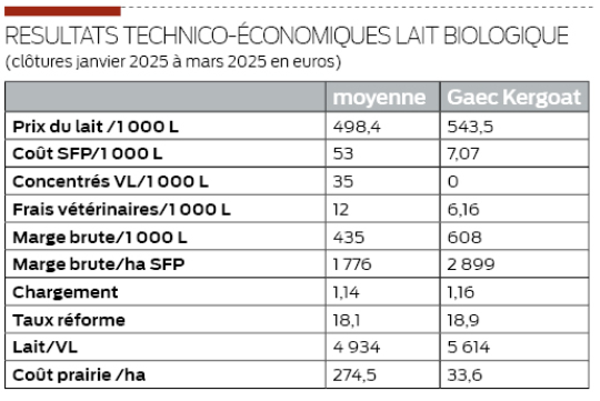 Côté résultats, le modèle interpelle. La marge brute atteint environ 608 €/1 000 litres, soit davantage que le prix du lait. Une performance rendue possible par un niveau de charges très bas (7 €/1 000 L de coût alimentaire).
