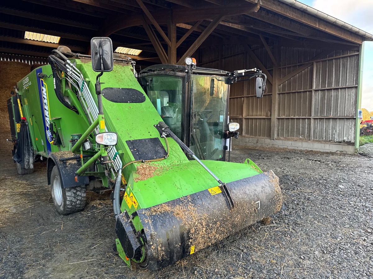 Sur les 243 ha de SAU, l’assolement se divise en 70 ha de céréales, 60 ha de maïs et le reste en herbe. En complément, les associés ensilent vers la mi-avril des méteils azotés (seigle-vesce- trèfles) cultivés en dérobée entre céréales et maïs « qui remplacent l’ensilage d’herbe ». Côté alimentation, chaque jour, une ration à l’auge est distribuée à 350 bovins (auxquels se rajoutent les veaux) à l’automotrice compacte Faresin arrivée en 2025 (« 2 L de lait/VL/jour gagnés depuis son arrivée »).